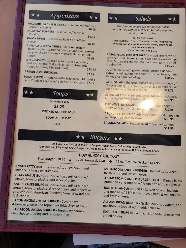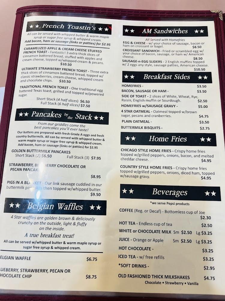 Salads appeal to the health-conscious, while the diner classics like homemade meatloaf and fried chicken comfort patrons. The dessert selection, with homemade pies, rounds out the meal perfectly. Prices average around $11-$13 per dish, ensuring the diner is accessible for all budgets. Whether it’s a quick bite or a family meal, Four Star Diner caters to diverse tastes while maintaining a focus on quality and tradition.